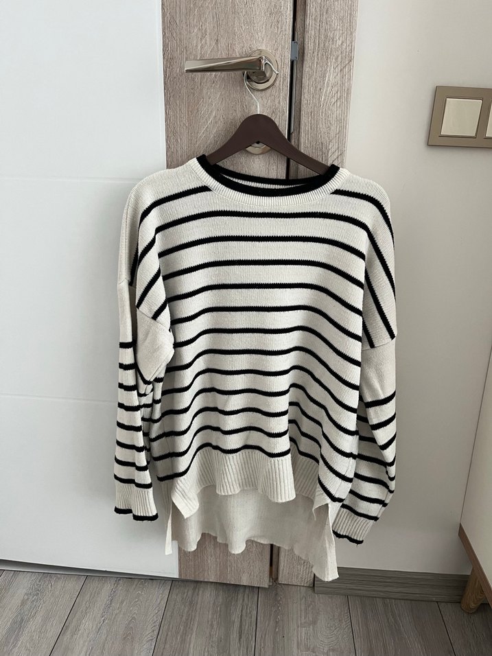 Beyaz ve gri çizgili, oversize kesim, uzun kollu triko kazak. Normal midi boyda, yuvarlak yaka ve rahat kullanıma uygun. Standart beden