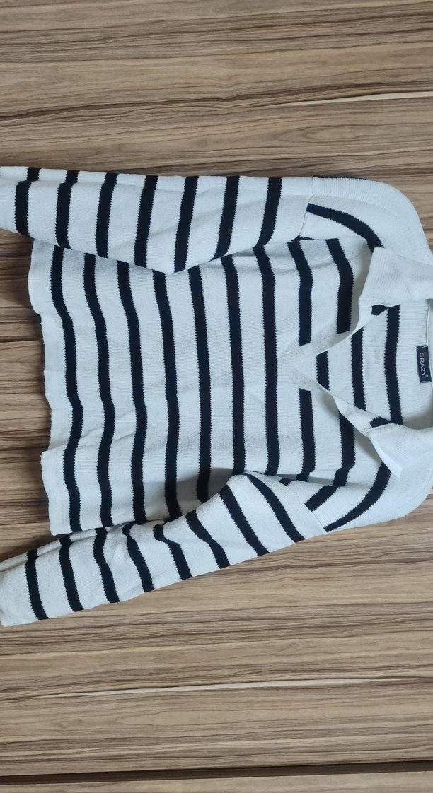 Uzun kollu, yakalı, bol kesim kadın kazak. Beyaz ve gri çizgili triko kumaştan, rahat sokak stili için uygundur.