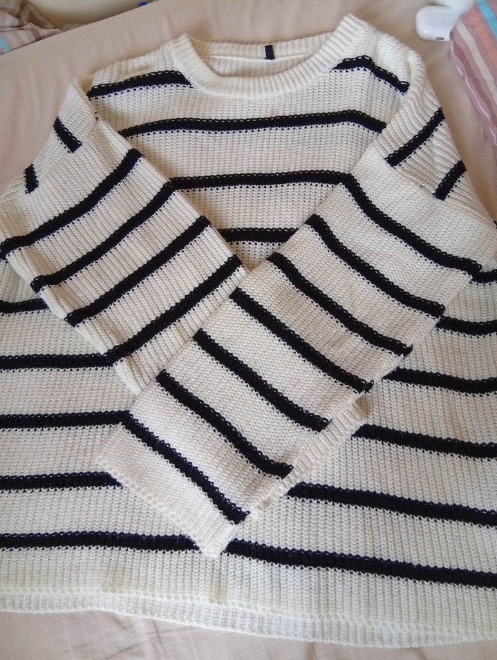 Uzun kollu, kayık yaka kadın kazağı, yumuşak triko kumaştan ve bol kesimlidir. Beyaz ve gri çizgili, rahat ve gündelik normcore tarzda bir modeldir.