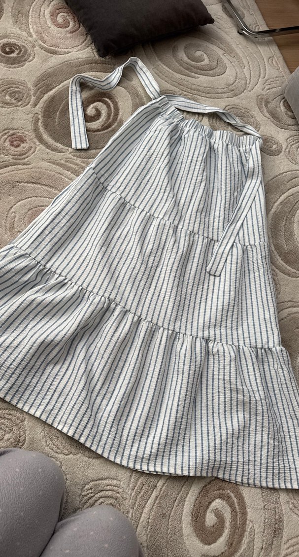 Çizgili beyaz ve gri renklerde, bol kesim uzun hamile eteği. Yumuşak keten kumaştan, bohem tarzda, günlük kullanıma uygun.