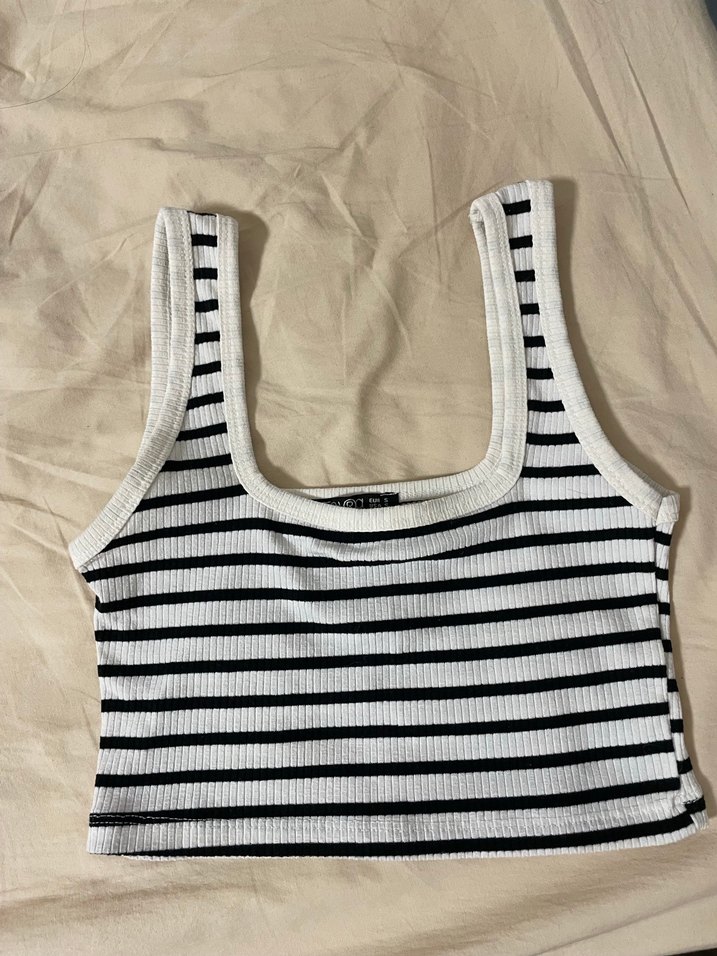 Kolsuz, tekne yakalı ve vücuda oturan kadın atleti. Yumuşak sentetik kumaştan, beyaz ve gri çizgili desenli. Günlük sokak stili için uygundur. pazarlik yapilirrrr