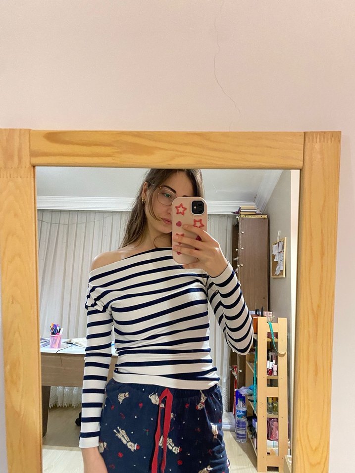 Beyaz crop triko bluz, uzun kollu ve kayık yaka tasarımıyla rahat bir kesime sahiptir. Çizgili deseni ve yumuşak dokusu günlük kullanım için şık ve rahat bir görünüm sunar.
