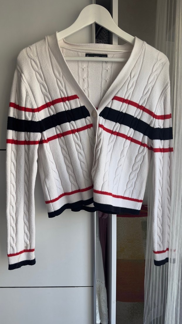 Fitted kesim, uzun kollu beyaz hırka, örme dokulu ve yüksek yakalıdır. Koyu renk çizgili desenleri ve midi boy uzunluğu ile trend sokak stiline uygundur.