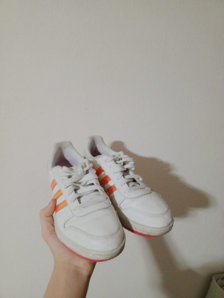 Çizgili renkli detaylara sahip beyaz kadın spor ayakkabısı, stiletto topuk ve cırt cırtlı yapısıyla spor sokak stilini tamamlar. Kauçuk tabanlıdır.