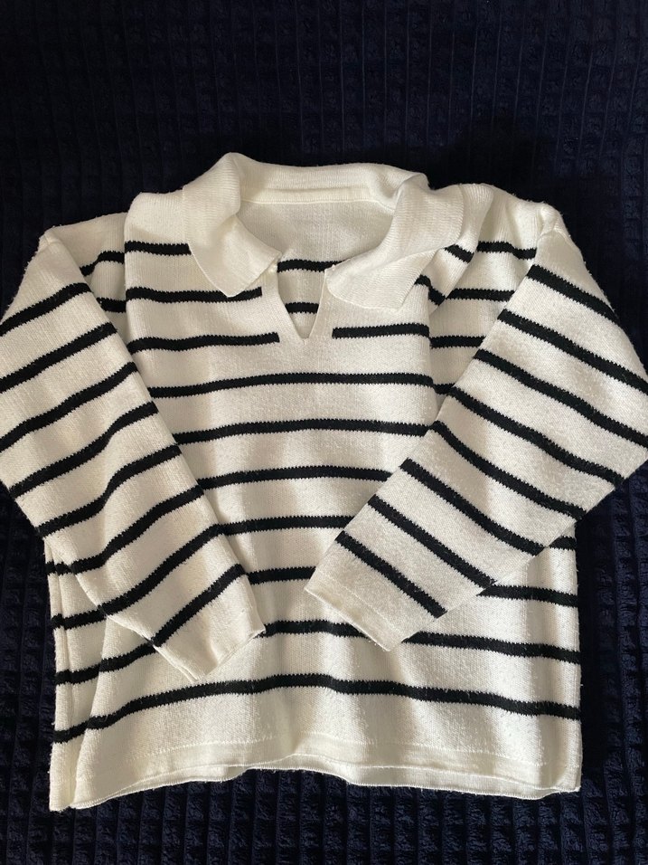 Bu kadın triko kazak, bol kesim, uzun kollu ve yakalıdır. Beyaz ve gri çizgili örme kumaştan yapılmıştır, gündelik sokak stili için uygundur.