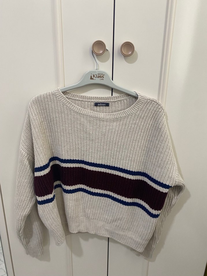 Uzun kollu, yuvarlak yakalı ve çizgili desenli beyaz, gri ve koyu renklerde bol kesim triko kazak. Günlük kullanıma uygundur. Bedeni her bedene uyar