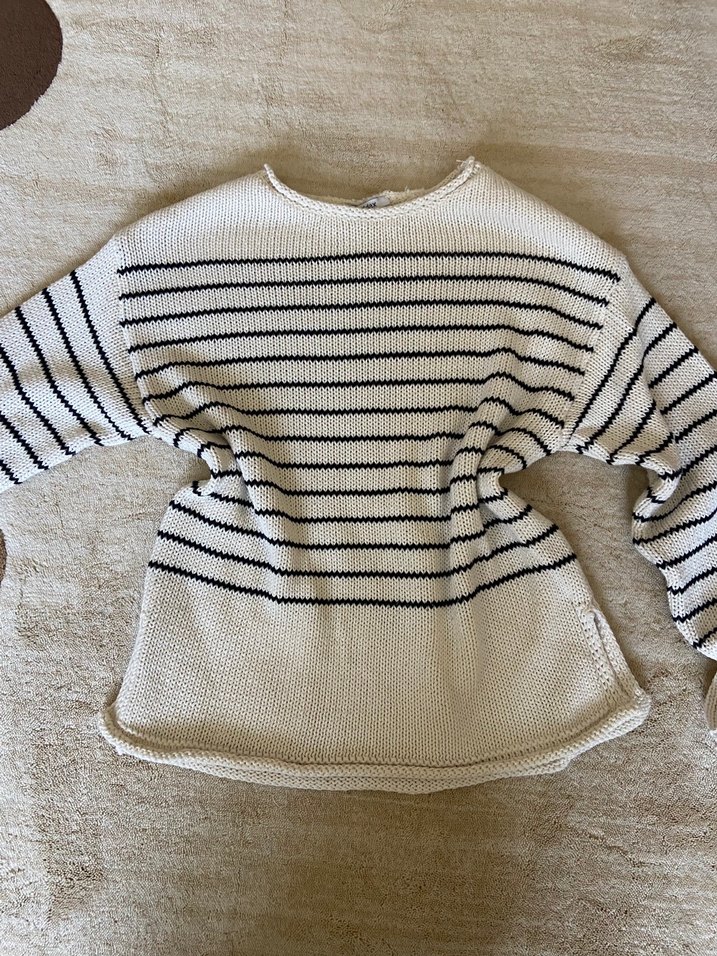 Uzun kollu, kayık yaka beyaz triko kazak, gri çizgilerle. Rahat kesim ve normal boyda, günlük kullanıma uygun.
