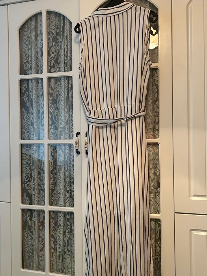 Beyaz zemin üzerine dikey gri çizgilerle uzun kadın tulumu. Notlu yaka, askılı kollu ve kuşaklı bel ile rahat kesim. Sentetik kumaştan, ofis ve günlük kullanıma uygun.