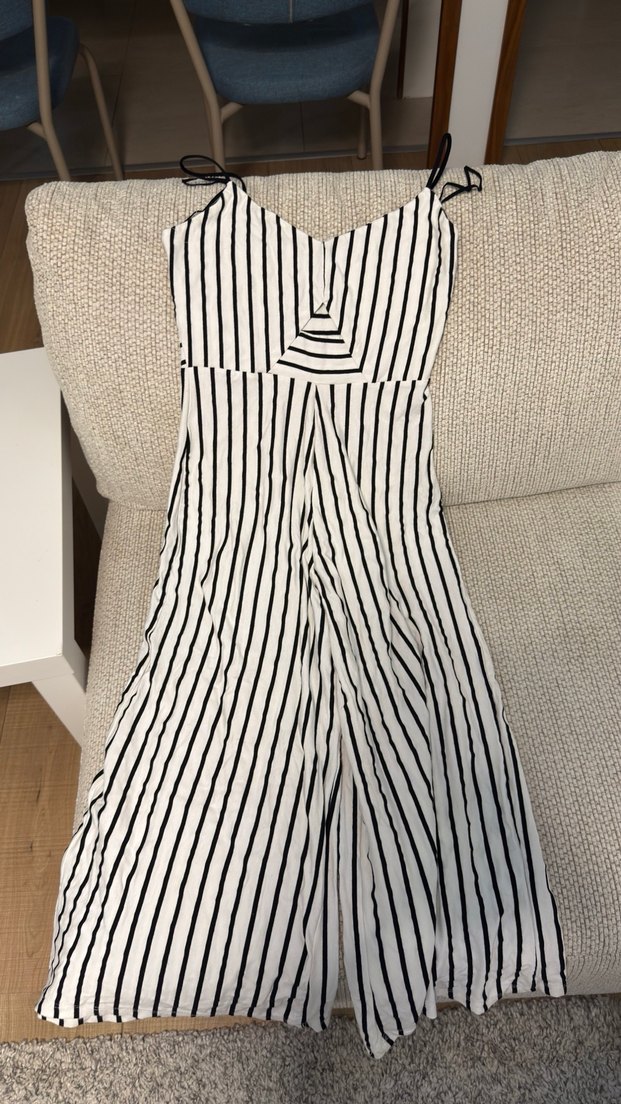 İnce askılı, siyah beyaz çizgili dar uzun tulum