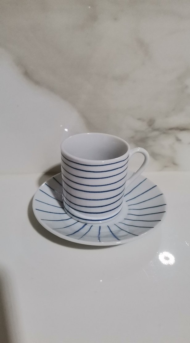 Çizgili Beyaz Kahve Fincanı ve Tabağı