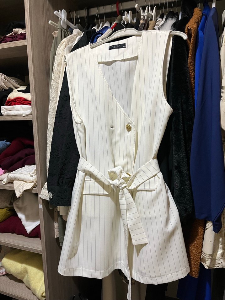 İnce çizgili, kemerli beyaz kadın yelek. Kolsuz, normal kesim ve pamuklu kumaştan üretilmiştir. Günlük kullanıma uygundur. Pantolonuda var.