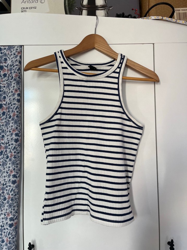 Pamuk kumaştan, yüksek yakalı ve çizgili beyazlacivert renklerde, vücuda oturan kolsuz kadın atlet. Rahat ve şık bir sokak stili parçası. ️