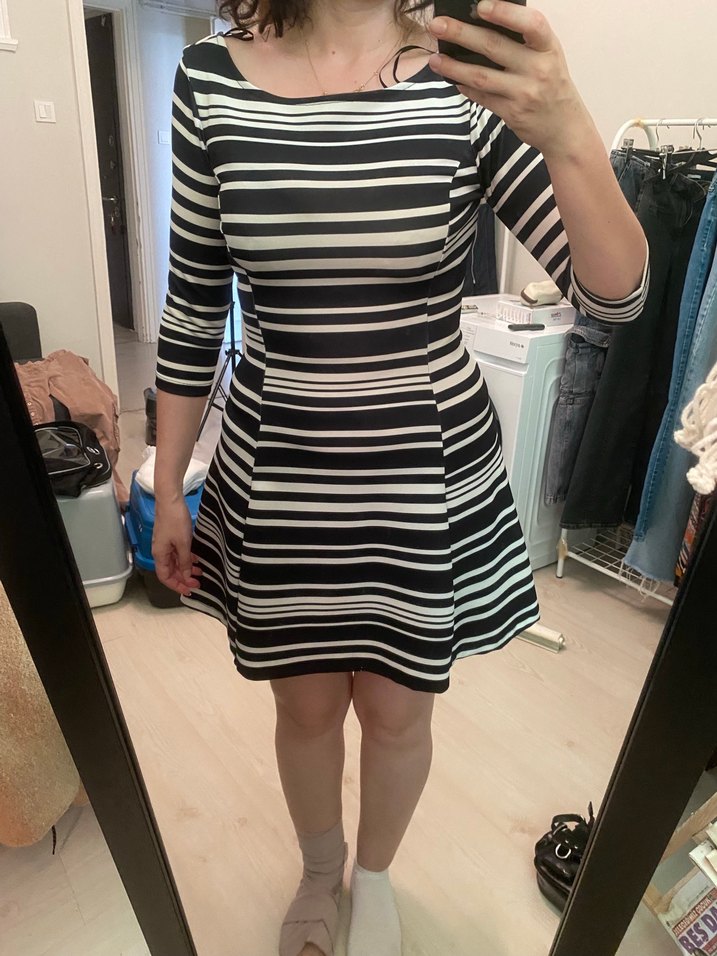 Tekne yaka ve pile detaylı, vücuda oturan midi elbise. Hafif renkli çizgili deseniyle romantik akşamlar için uygundur.