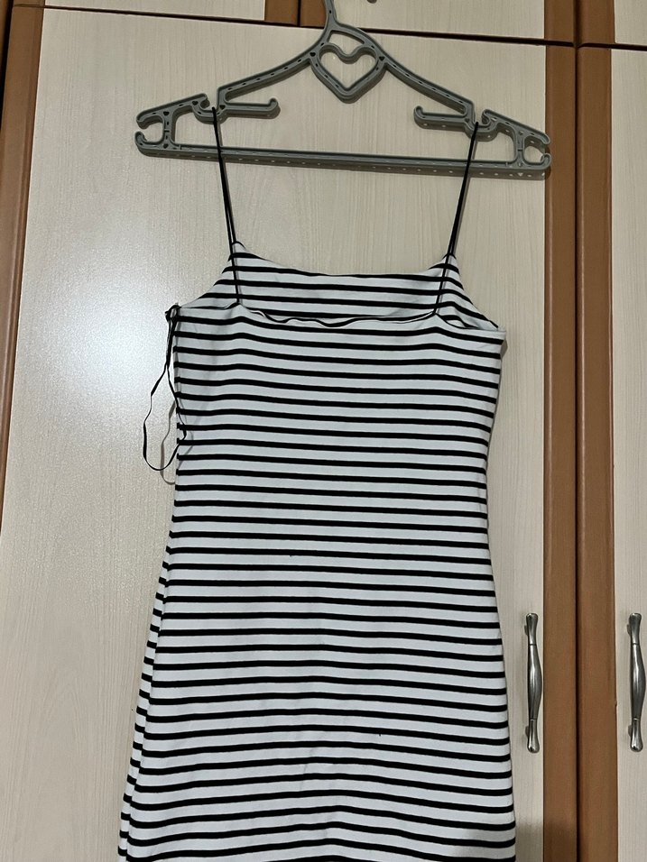 İnce askılı, tekne yaka, elastik detaylı, çizgili beyaz siyah mini elbisedir. Günlük kullanıma uygun sentetik kumaştan üretilmiştir. Boy88cm Kolaltı37cm