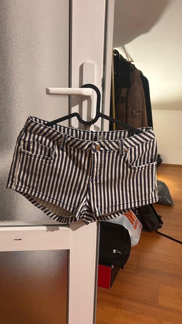 Çizgili desenli, beyaz mini kot şort, belde tokalı detaylara sahip. Sokak stiline uygun, günlük kullanıma elverişli kısa kesim.
