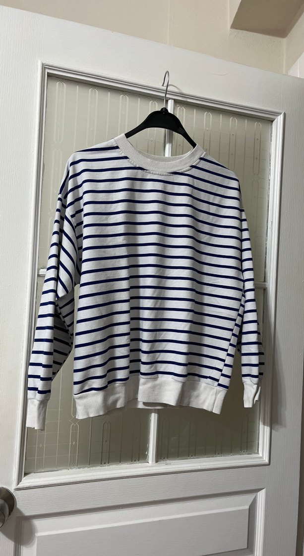 Çizgili desenli, uzun kollu beyaz pamuklu sweatshirt, rahat kesimi ve bisiklet yaka detayıyla günlük sokak stiline uygundur.