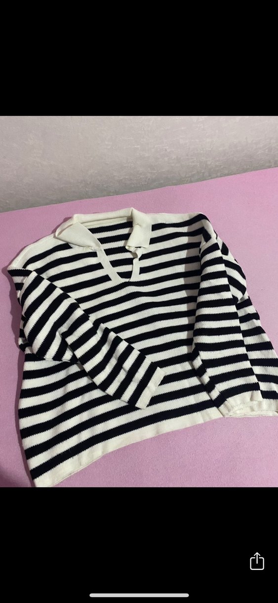 Uzun kollu, yakalı ve bol kesim kadın triko kazak. Yumuşak pamuktan örülmüş, koyu beyaz çizgili ve Paris sokak modasını yansıtan midi boyda rahat bir model.