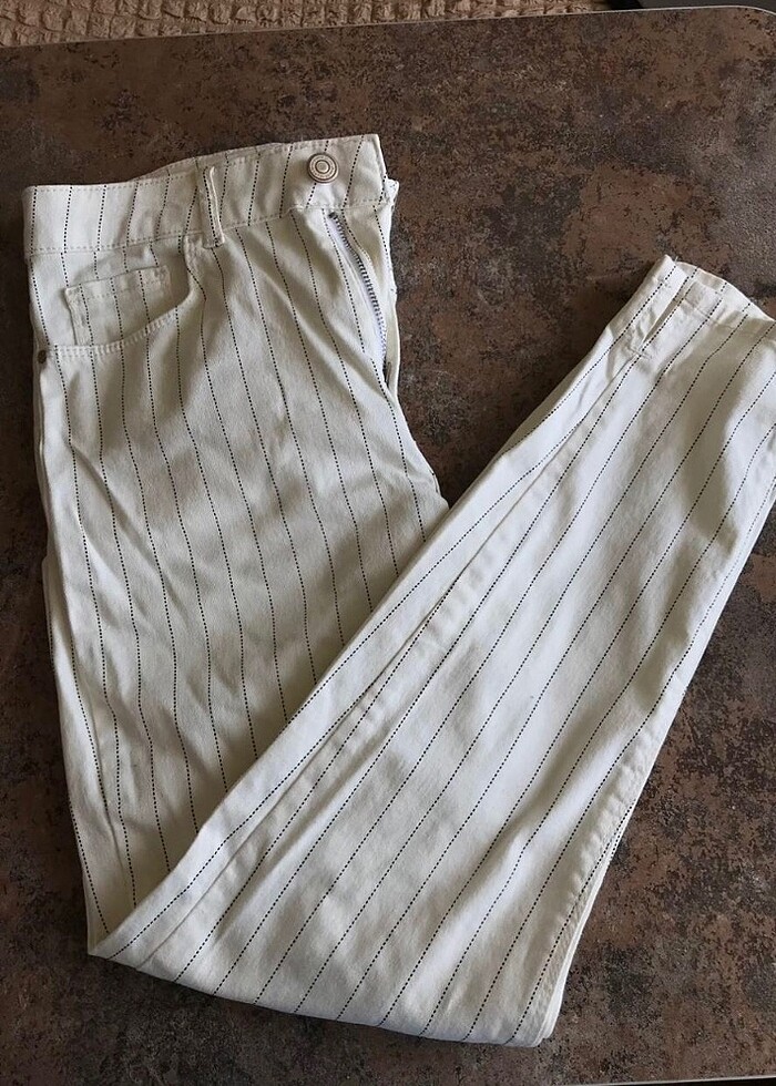 Defacto dan aldım.Dışarda hiç giymedim.Bilek boy beyaz çizgili pantolon.Tekliflere açığım.
