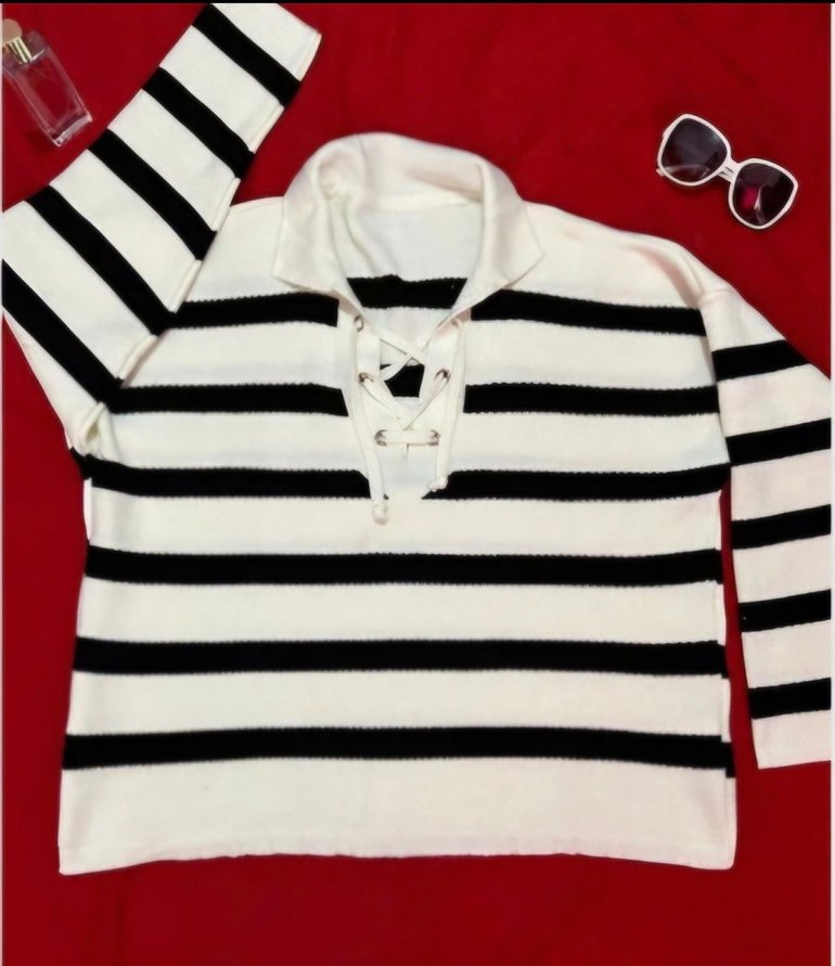 Uzun kollu, kayık yaka ve bol kesim olan bu çizgili siyah beyaz triko kazak, günlük rahat sokak stiline uygundur.