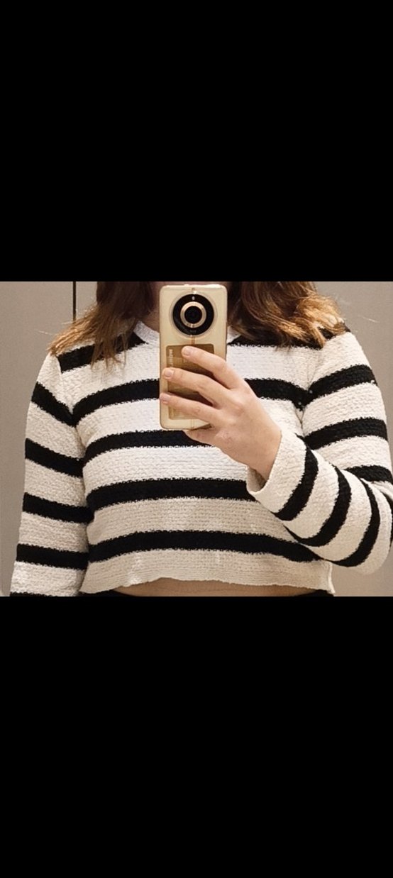 Uzun kollu, kadın kazak, beyaz ve siyah çizgili desende. Triko kumaştan, günlük kullanım için uygun casual streetwear tarzında. ✨
