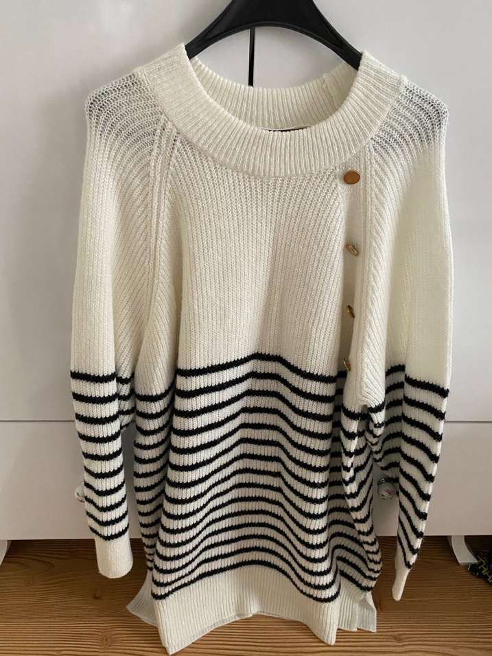 Siyah beyaz çizgili triko elbise , uzun kollu, yuvarlak yaka ve bol kesim. Üründe hiçbir deforme yoktur.