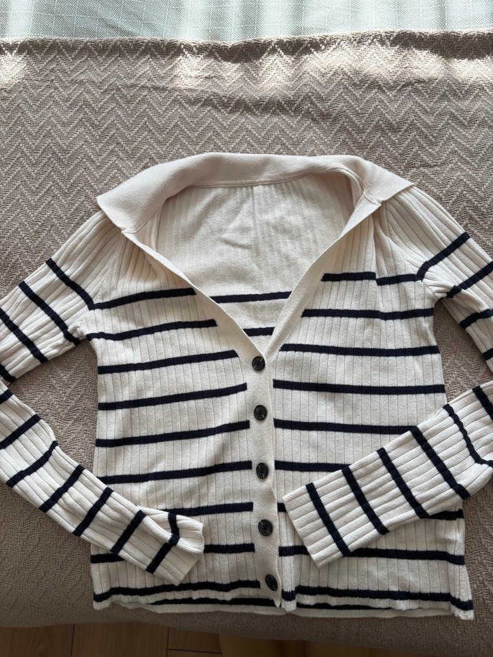 Düğmeli, uzun kollu, yakalı beyaz triko kadın hırka, çizgili ve ince dokuma kumaştan, günlük kullanıma uygun.