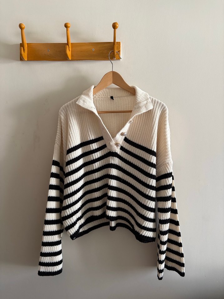 Uzun kollu, yakalı ve çizgili beyaz triko kadın kazak. Rahat, normal boy ve bol kesim, günlük kullanım için uygun şık bir parça. 2 kol altı arası 65 cm