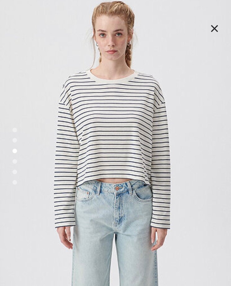 Mavi markalı, lacivert ve beyaz çizgili ince uzun kollu tişört. Etiketi yoktur ama hiç kullanılmamıştır. Hiçbir sorunu yoktur. Ölçüleri görsellerde mevcuttur.