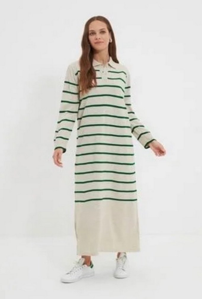 Uzun, bol kesim elbise, uzun kollu ve yakalıdır, beyaz zemin üzerinde yeşil çizgiler bulunur. Yumuşak sentetik kumaştan, günlük rahat sokak stili için uygundur.