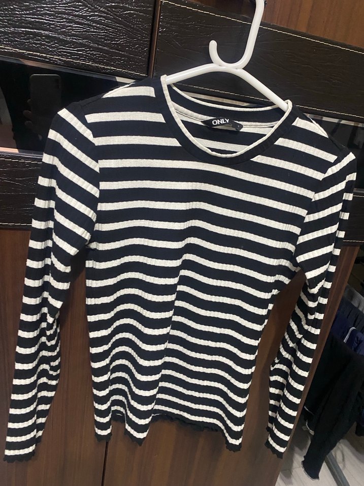 Çizgili desenli ve uzun kollu, vücuda oturan kadın kazak