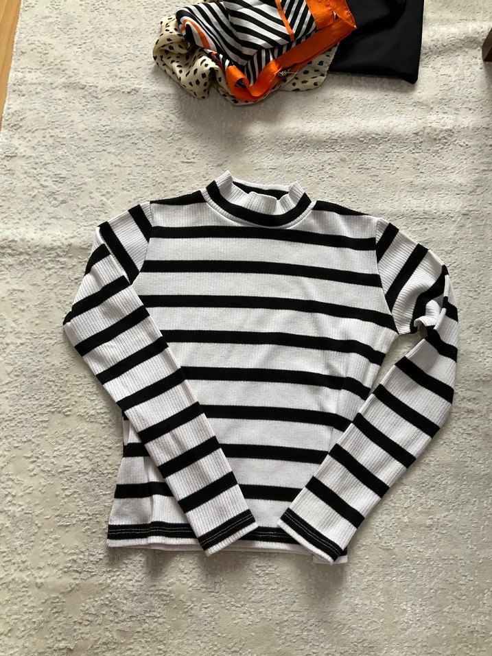Uzun kollu, boğazlı, vücudu saran kesime sahip kadın kazağı. Yumuşak yün kumaştan, beyaz ve gri çizgili desende, rahat sokak stiline uygun.