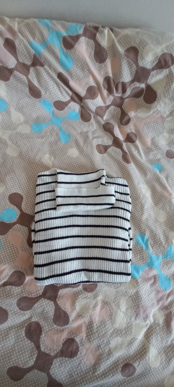 Çizgili desenli, boğazlı ve uzun kollu, yumuşak dokulu triko kumaştan yapılmış. vücutta şekillenen bir kumaşı var çok güzel