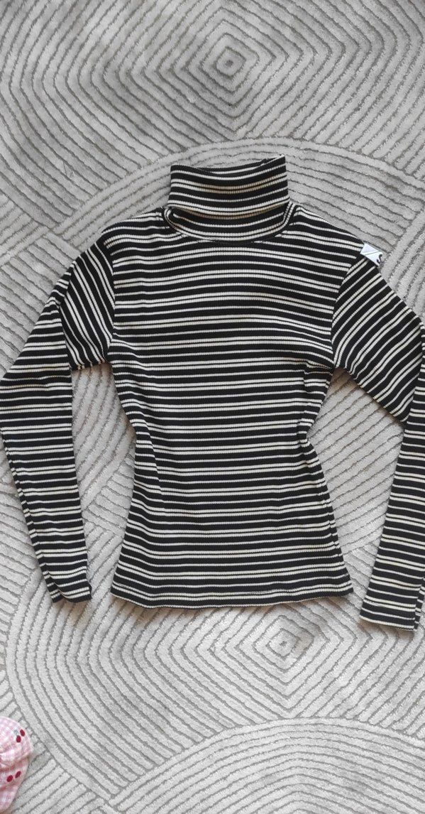 Çizgili desenli, boğazlı ve uzun kollu, ince kesim gri triko kazak. Günlük sokak stiline uygun rahat bir parça.