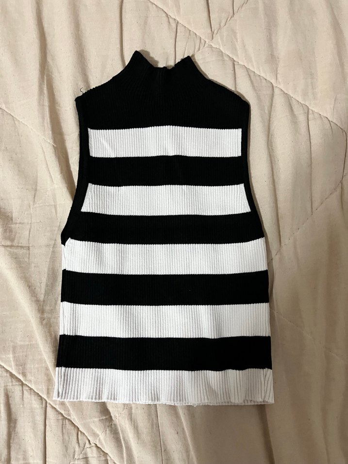 Boğazlı, kolsuz ve çizgili örme kadın süveter. Fitted kesimiyle günlük sokak stiline uygun.