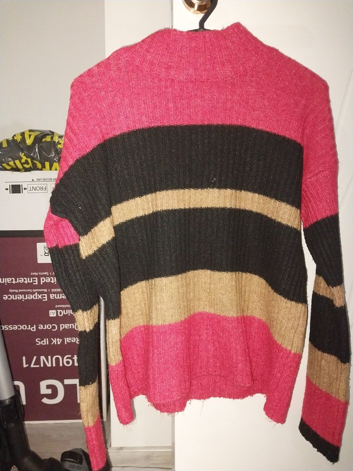 Uzun kollu, boğazlı ve çizgili desenli triko kadın kazak. Bol kesim ve koyu pembe, siyah, bej renklerde rahat ve günlük kullanıma uygun.