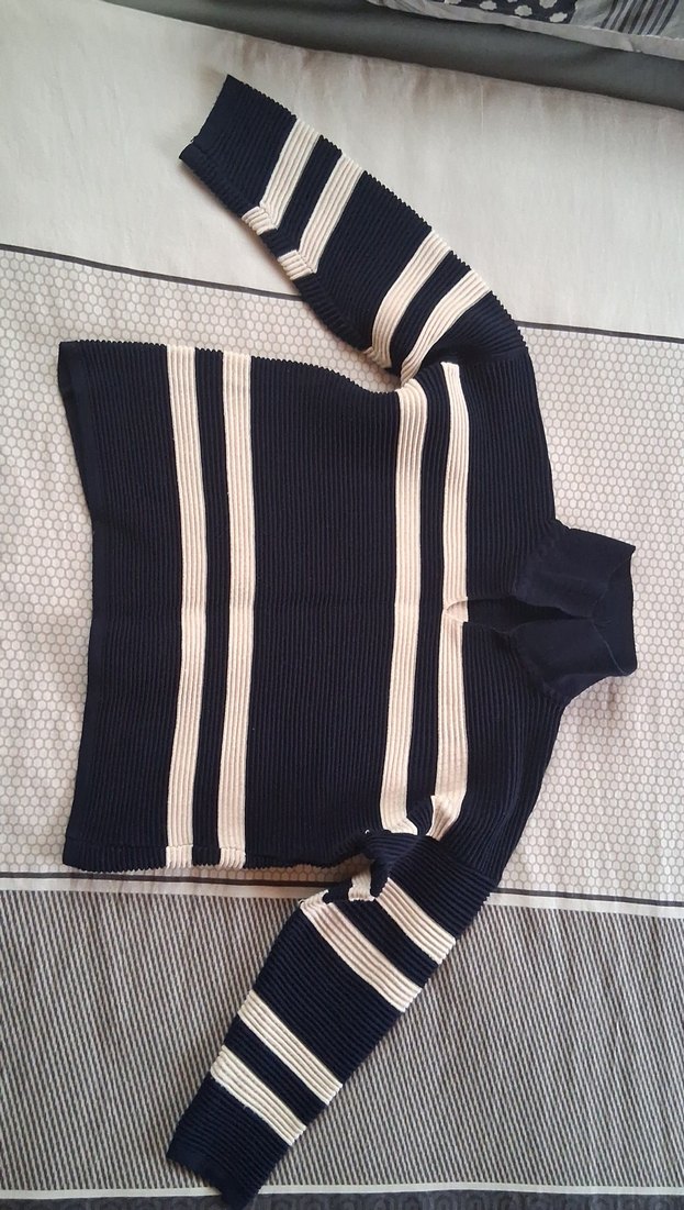 Mavi renkli, çizgili ve boğazlı uzun kollu kadın kazak. İnce örme yapısı ve normal boyuyla günlük kullanıma uygundur.