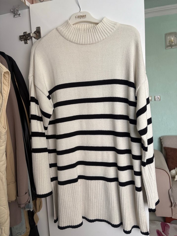 Çizgili Boğazlı Oversize Triko Kazak
