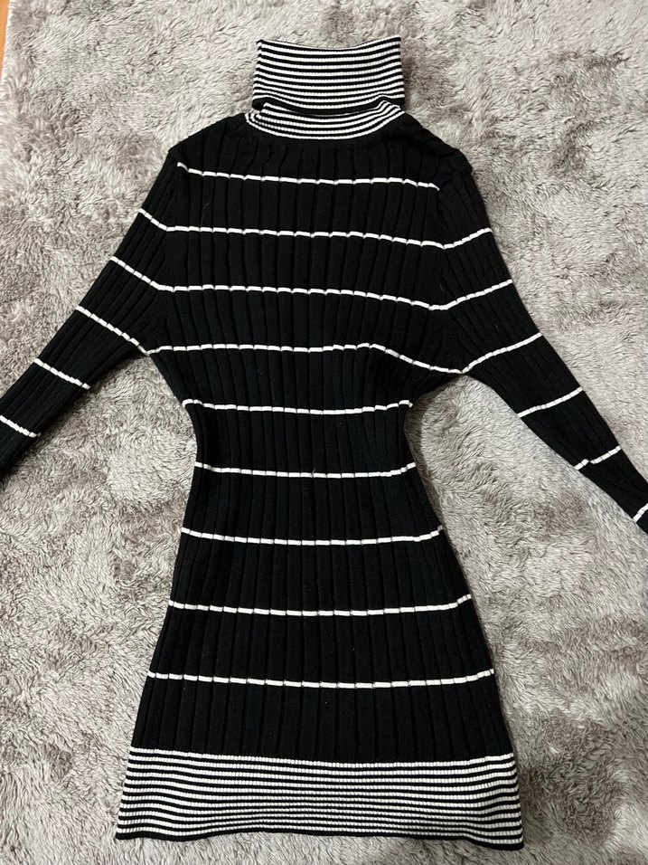 Fitted kesim, boğazlı ve uzun kollu siyah triko bluz, gri ve beyaz çizgilerle süslenmiş. Rahat ve sokak stiline uygun, günlük kullanıma ideal.