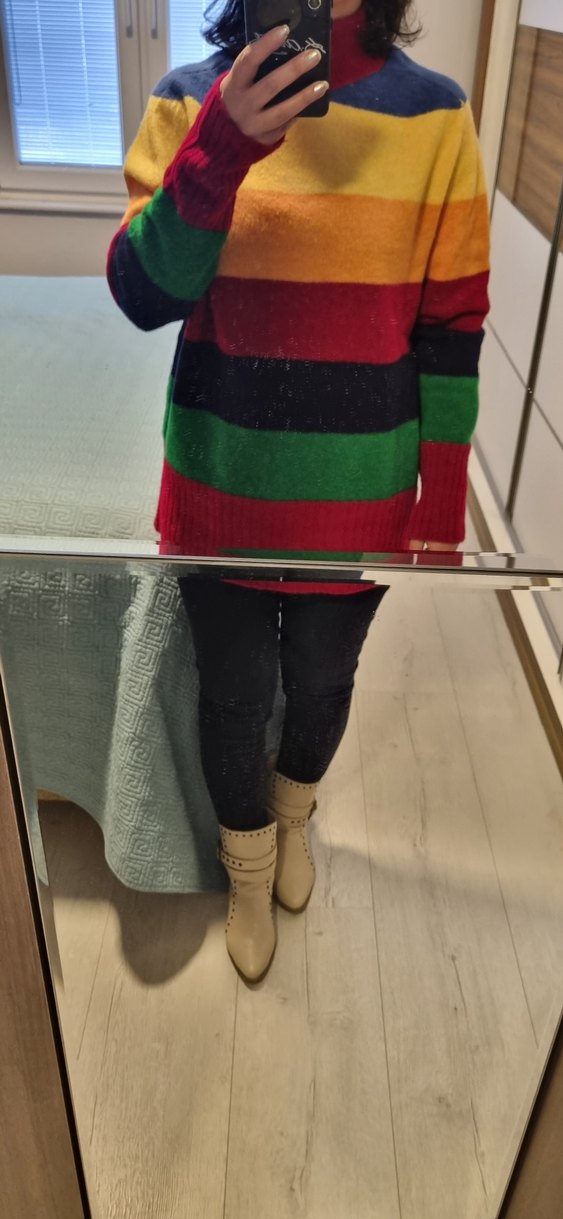 Kadınlar için çizgili, boğazlı, yün triko kazak. Midi boy, bol kesim ve uzun kolludur. Rahat sokak stili için uygundur.