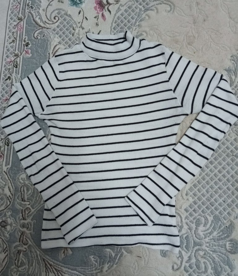 Boğazlı ve uzun kollu, çizgili triko kumaştan yapılmış, vücuda oturan kadın kazak. Günlük kullanıma uygun, rahat ve şık bir sokak stili sunar.