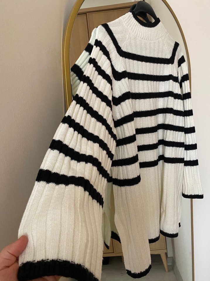 Bu rahat triko kazak, uzun kollu ve boğazlıdır. Beyaz zemin üzerinde siyah çizgilerle bol kesim sunar, sokak stiline uygundur.