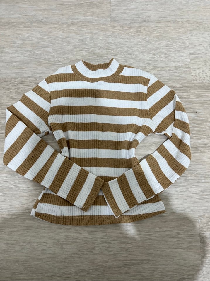 Ürün sıfırdır Xs-s-m bedene uyumludur Boğazlı, uzun kollu, fitted kesim kadın kazak. Açık kahverengi ve beyaz çizgili, yumuşak triko kumaştan üretilmiştir. Rahat ve trend günlük stil için uygundur.