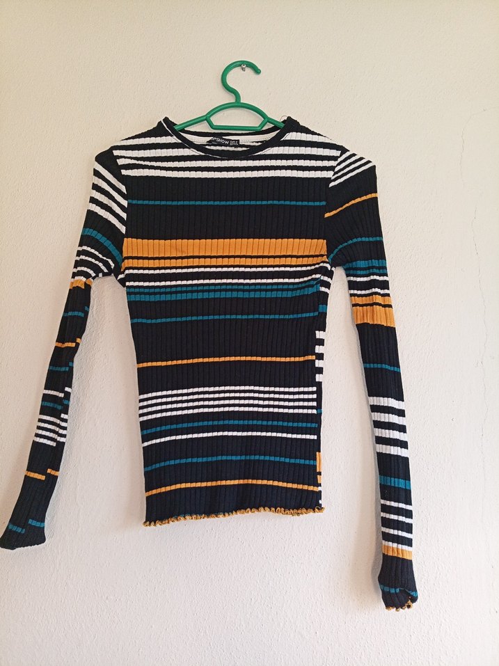 Boğazlı, uzun kollu, çizgili ve çok renkli örme kadın kazak. Normal midi boyda, sokak stiline uygun rahat bir parça.