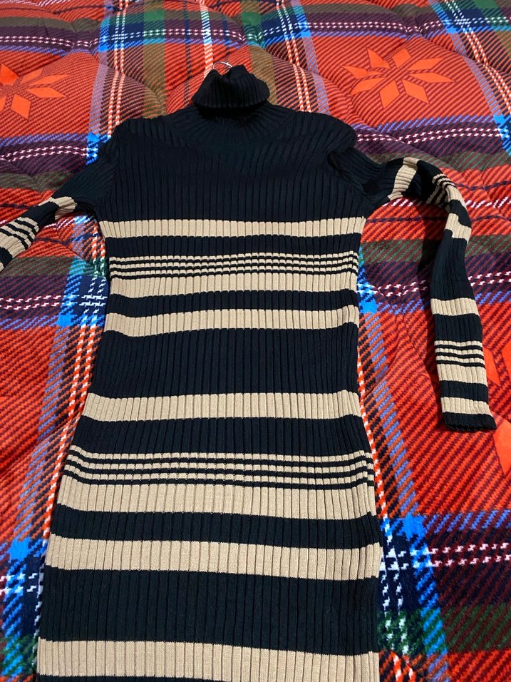 Boğazlı ve uzun kollu, çizgili desenli, fitted kesim triko elbise. Rahat ve şık, günlük kullanıma uygun sokak stili.