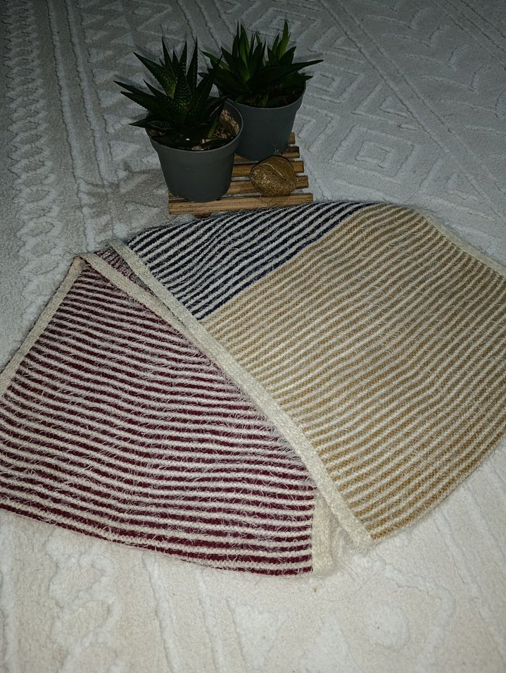 Çizgili desenlere sahip bohem tarzda, çok renkli ve yumuşak dokulu boyunluk atkı