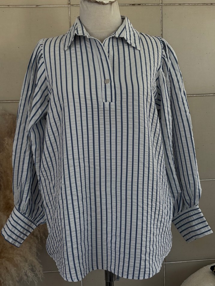 Uzun kollu, yakalı ve bol kesim kadın gömlek. Çizgili deseni ve düğme detaylarıyla rahat kullanıma uygun.standart beden 36/40 beden uyumlu