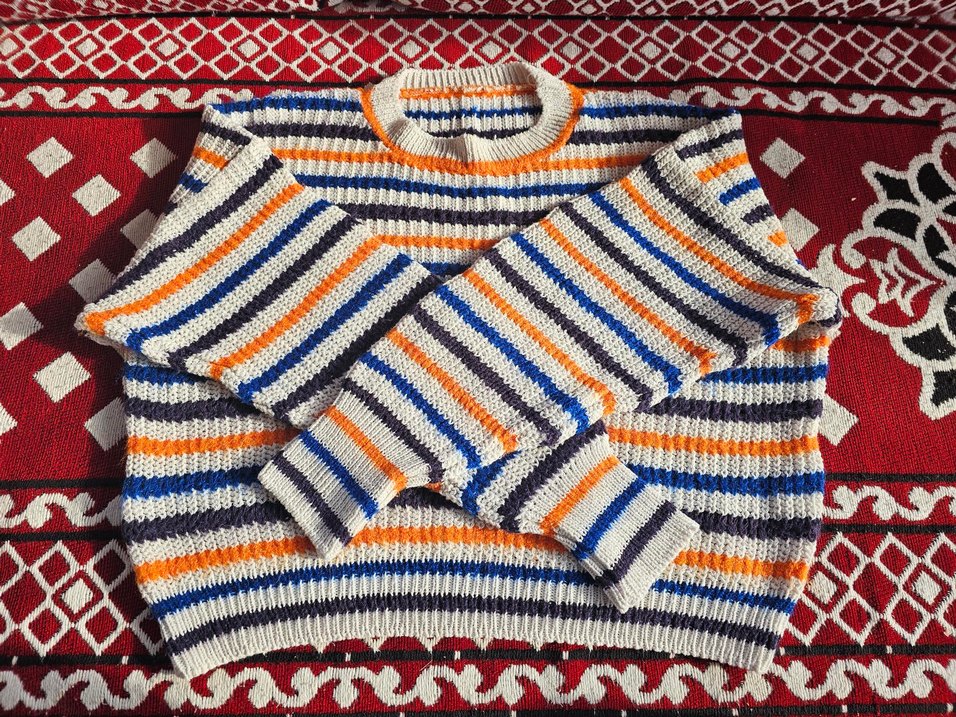 Kadınlar için çizgili, uzun kollu ve yuvarlak yakalı triko kazak. Gri, mavi ve turuncu renklerde, bol kesim ve retro tarzda, rahat ve günlük kullanıma uygun.