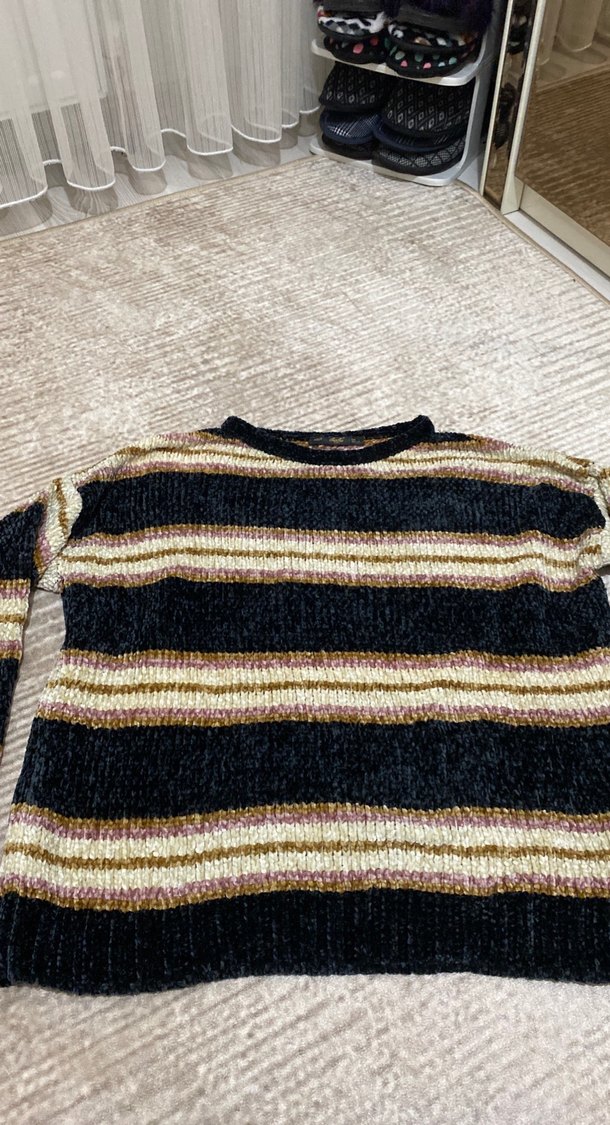 Çok renkli çizgili, uzun kollu ve yuvarlak yakalı bohem tarzda, rahat kesim kadın triko kazak. Günlük kullanıma uygun, sıcak tutar.