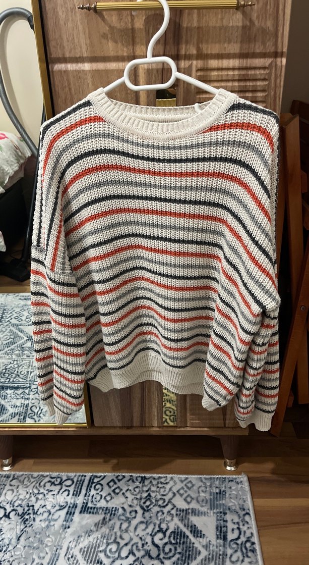 Çok renkli çizgili, bohem tarzda, uzun kollu, yuvarlak yaka, bol kesim kadın triko kazak. Rahat ve günlük kullanıma uygun.