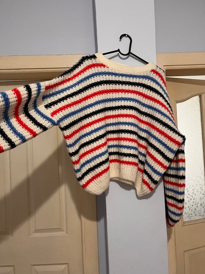 Kadınlar için bol kesim, tekne yaka ve uzun kollu triko kazak. Hafif renklerde çizgili desenli, örme kumaştan yapılmıştır. Rahat, bohem ve retro tarzda günlük kullanım için uygundur. Kusuru yoktur